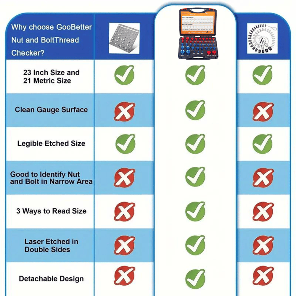 ✅Upgraded Thread Checking Set: Every thread checker is inserted into well cut foam that holds them firmly in place to prevent them from bouncing around in the box, but not so tight that you can easily remove them. Easier to use than connected nut or thread checkers, because you no longer have to carry a whole bunch of gauges to measure individual screws or nuts and can reach any tight spot.