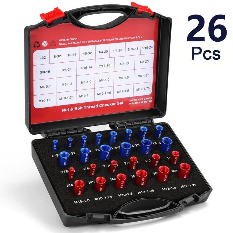 ✅26Pcs Contain: M4x0.7, M5x0.8, M6x1.0, M7x1.0, M8x1.0, M8x1.25, M10x1.0, M10x1.25, M10x1.5, M12x1.25, M12x1.5, M12x1.75.6-32, 8-32, 10-24, 10-32, 1/4-20, 1/4-28, 5/16-18, 5/16-24, 3/8-16, 3/8-24, 7/16-14, 7/16-20, 1/2-13, 1/2-20.(bolt and nut thread identifier, thread gauge sae andmetric)