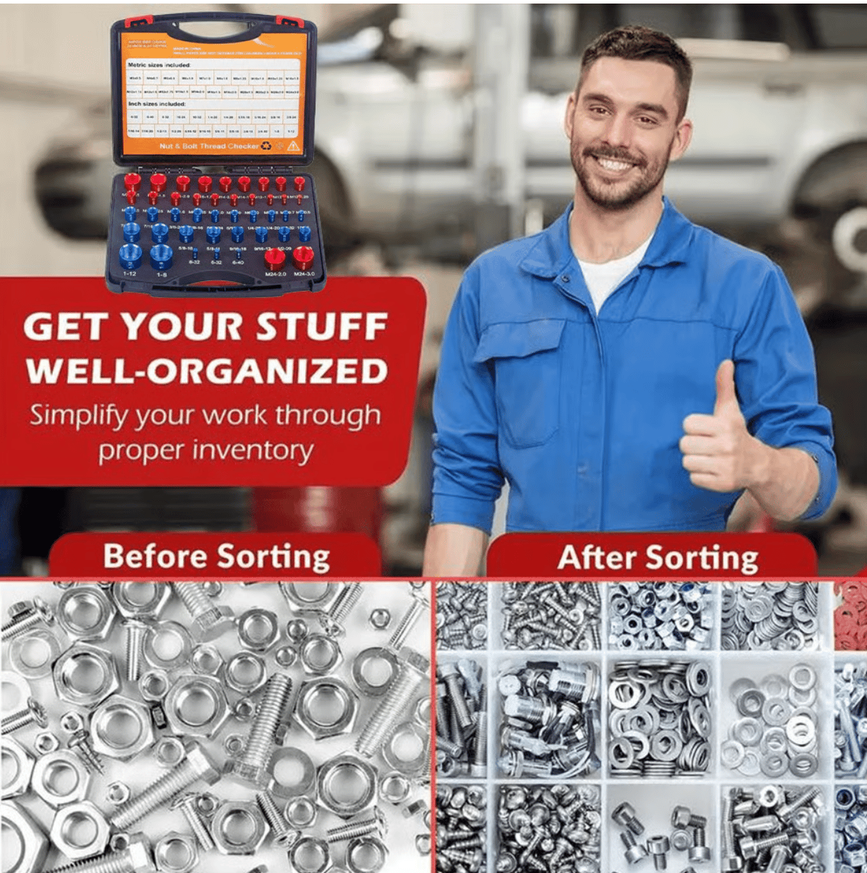 ✅Nut and Bolt Size Storage Box: Featuring clear nut and bolt labels, our gauge organizer box makes nut and bolt identification quick. Foam firmly holds gauges in place for organization. Blue aluminum plated for inch size. Red aluminum plated for metric size.
