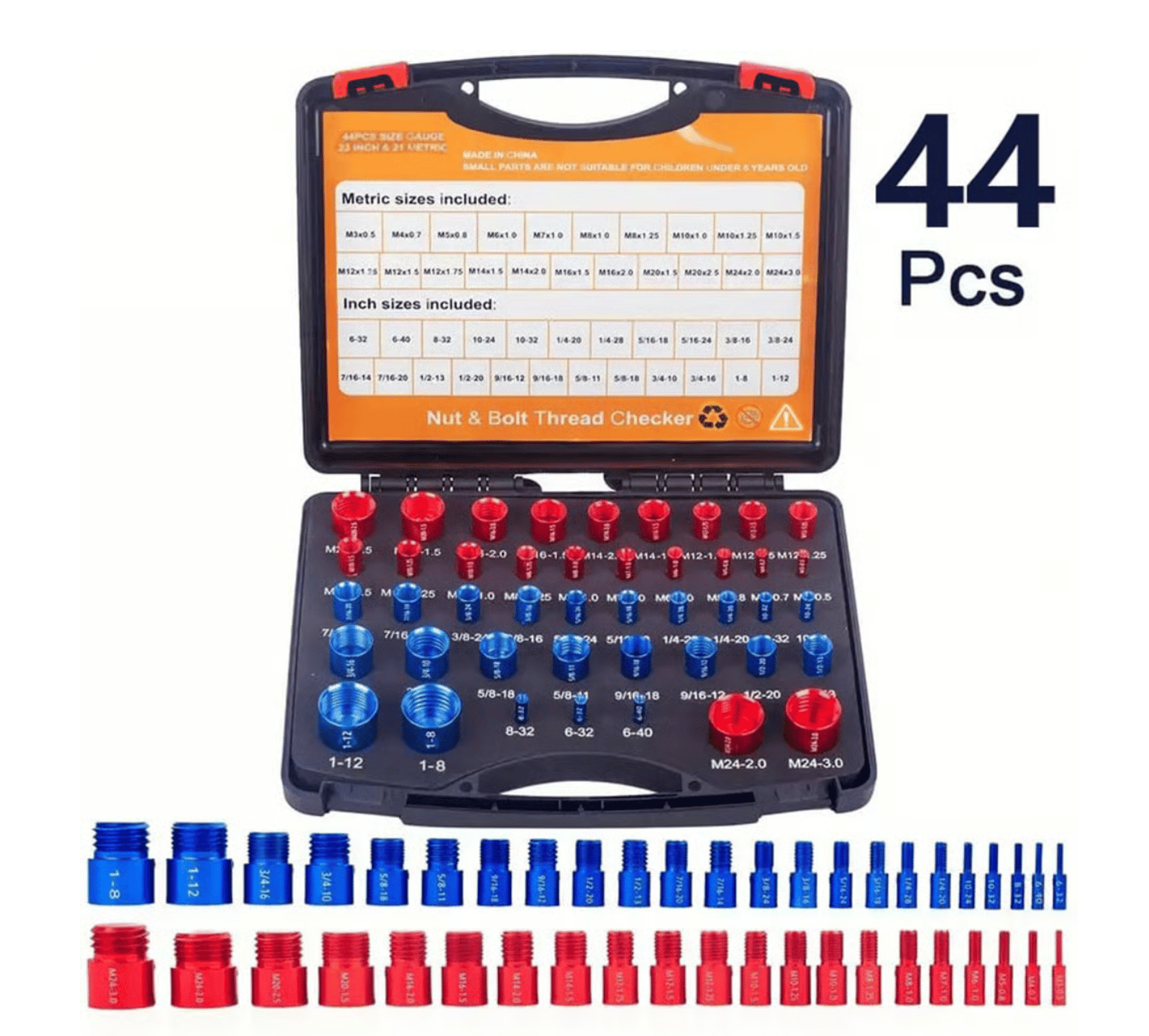 ✅44Pcs Contain: M3x0.5, M4x0.7, M5x0.8, M6x1.0, M7x1.0, M8x1.0, M8x1.25, M10x1.0, M10x1.25, M10x1.5, M12x1.25, M12x1.5, M12x1.75, M14x1.5, M14x2.0, M16x1.5, M16x2.0, M20x1.5, M20x2.5, M24x2.0, M24x3.0. INCHES: 6-32, 6-40, 8-32, 10-24, 10-32, 1/4-20, 1/4-28, 5/16-18, 5/16-24, 3/8-16, 3/8-24, 7/16-14, 7/16-20, 1/2-13, 1/2-20, 9/16-12, 9/16-18, 5/8-11, 5/8-18, 3/4-10, 3/4-16, 1-8, 1-12(bolt and nut thread identifier, thread gauge sae andmetric)
