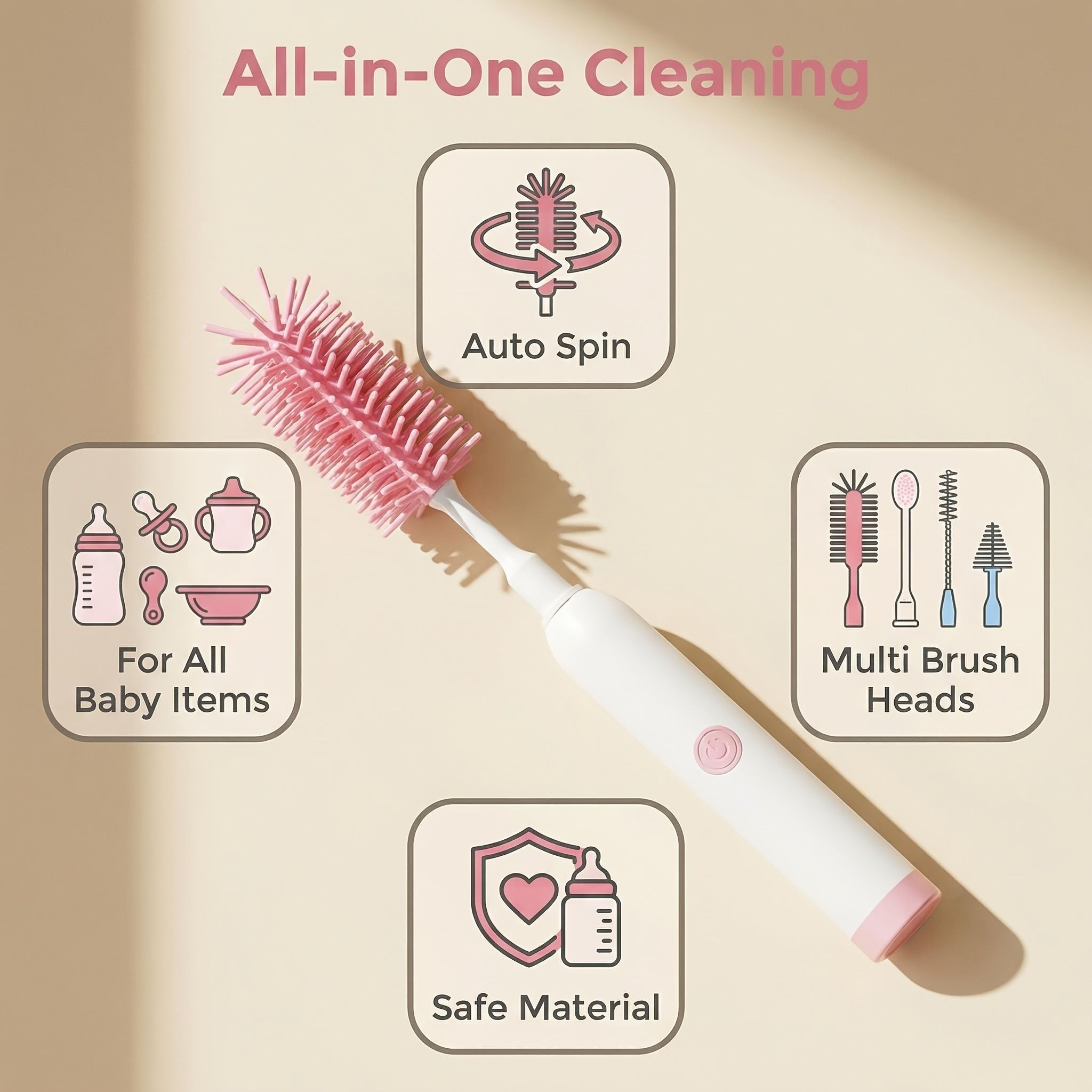 ✅ Electric Motor for Powerful, Hands-Free CleaningThe rechargeable motor spins the silicone brushes at high speed, scrubbing away milk residue and stains with minimal effort. Just press the button, and the brush does the work for you—no more tedious hand-scrubbing!